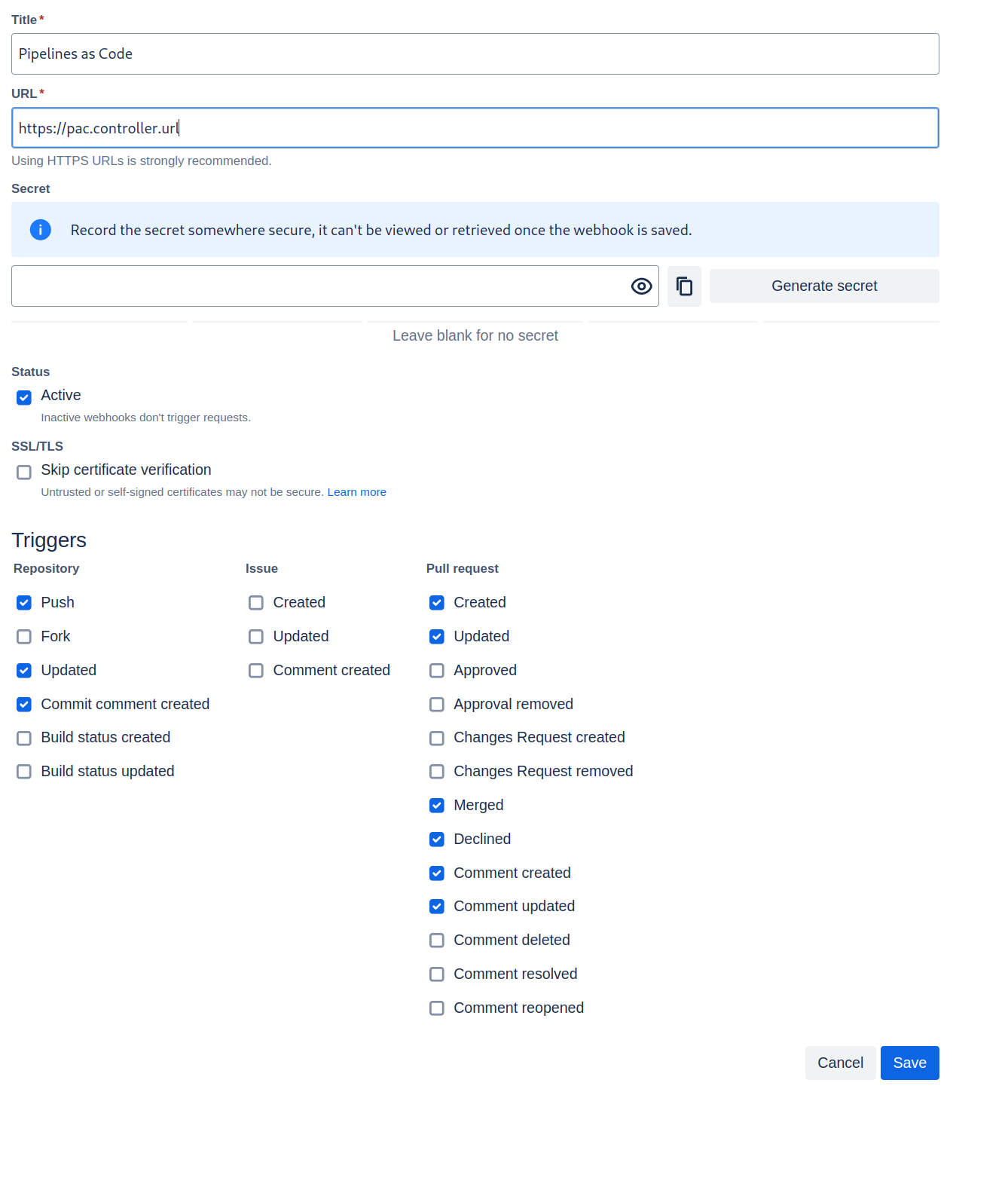 • For an existing Repository, if webhook secret has been deleted (or you want to add a new webhook to project settings) for Bitbucket Cloud, use tkn pac webhook add command to add a webhook to project repository settings, as well as update the webhook.secret key in the existing Secret object without updating Repository.